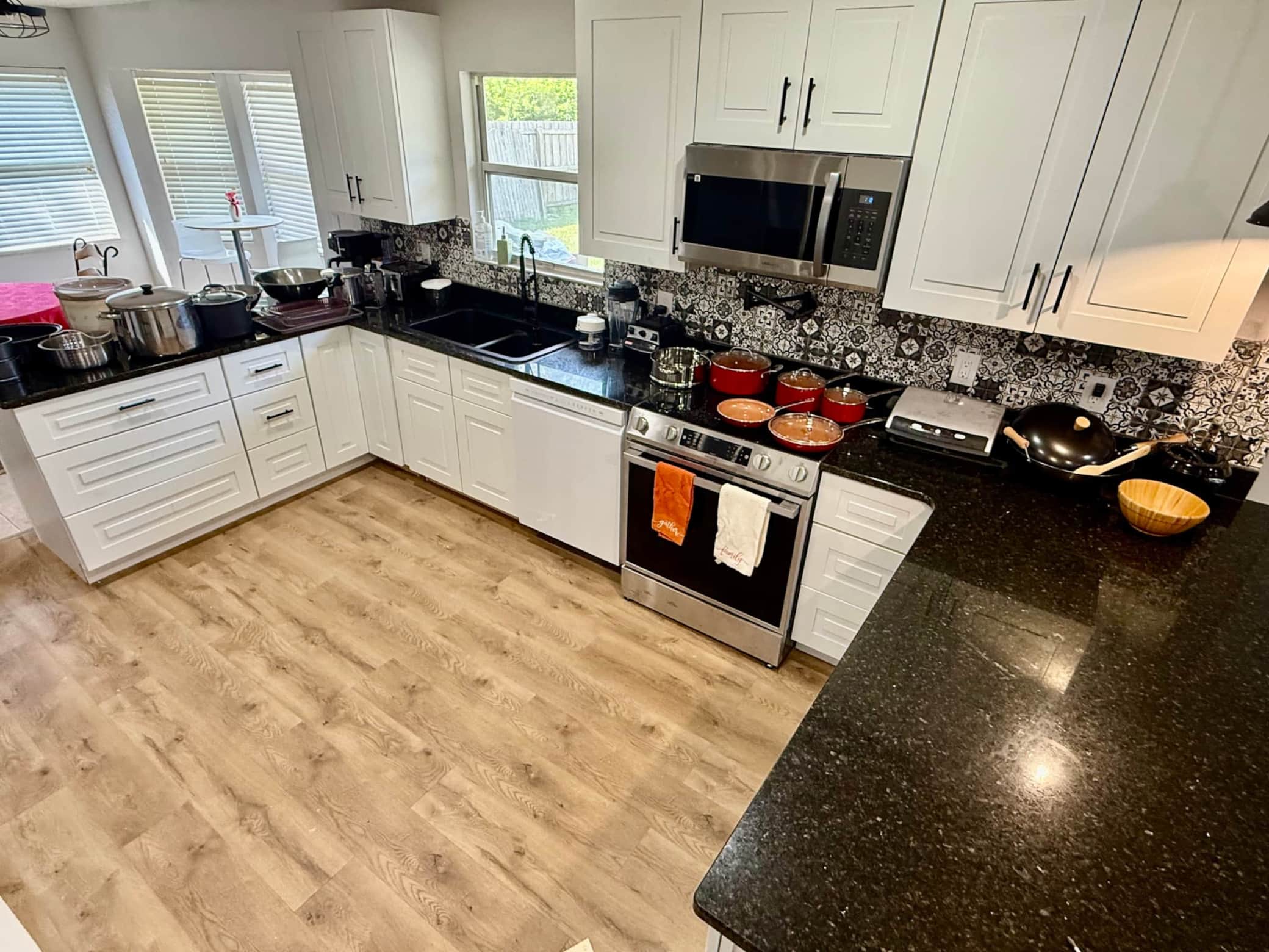 This spacious ranch home has many amenities and upgrade for you and your guests will have a memorable stay. There is a huge fenced back yard for kids and/or pets can play. Four separate dining areas provide seating for 20 guests